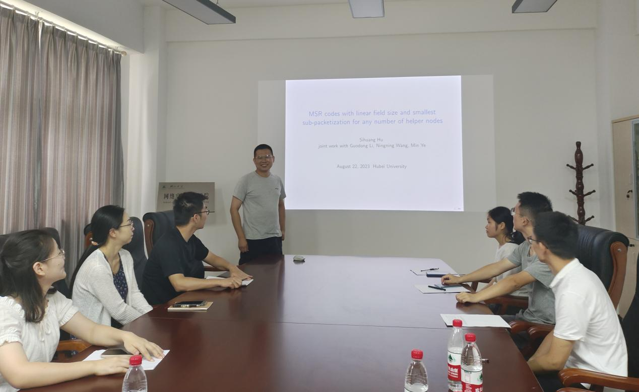 2023年8月22日,山东大学英国365集团公司官网副经理胡思煌教授应邀为公司密码与编码学团队师生在数统公司403会议室作了题为《MSR Codes with Linear Field Size and Smallest Sub-Packetization for Any Number of Helper Nodes》的学术报告。