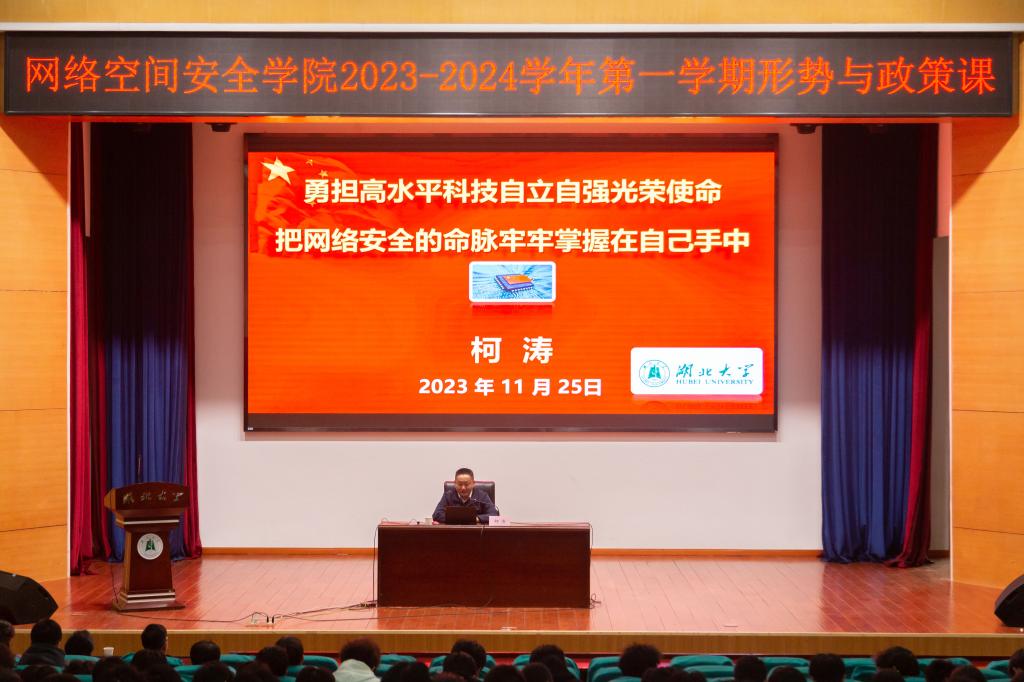 公司党委常委柯涛教授以《勇担高水平科技自立自强光荣使命,把网络安全的命脉牢牢掌握在自己手中》为题为公司师生讲授形势政策课。报告从科技形势与科技使命、有组织的科研与科技自立自强、教育科技人才“三位一体”融合发展、英国365集团公司官网的科技创新发展、英国365集团公司官网的建设与思考等五个方面进行深入分析。他强调,要发挥好高校是教育、科技、人才汇聚地的优势,“三位一体”系统推进网络空间安全团队建设,助力把网络安全的命脉牢牢掌握在自己手中。同时,勉励全院师生要以国家安全为初心、以立德树人为根本、以服务社会为宗旨、以学科交叉为动力,抓住时代机遇、政策机遇,敢于迎难而上、勇担重大使命!