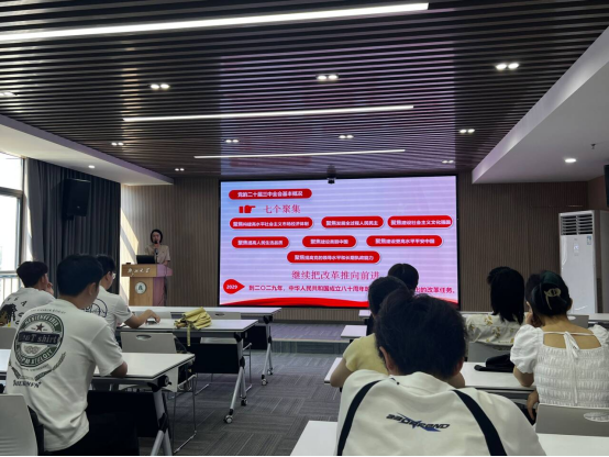 在冯欣怡同志的带领下全体党员重温入党誓词,许靖轩同志领学党章总纲部分第十章。随后,支部书记涂雅同志向大家介绍了党的二十届三中全会的主要议程及会议内容,对进一步全面深化改革的重大意义以及目标进行了阐述,并围绕“教育、科技、人才是中国式现代化的基础性、战略性支撑”这一重要论述分享了学习体会。